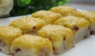 17、将熬好的黄米均匀铺在江米上,抹平,刷油或盖上容器盖保湿,入冰箱冷藏定型后切块即食。