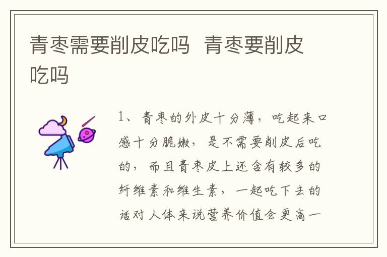 1、青枣的外皮十分薄,吃起来口感十分脆嫩,是不需要削皮后吃的,而且青枣皮上还含有较多的纤维素和维生素,一起吃下去的话对人体来说营养价值会更高一些。