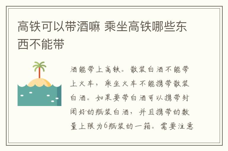 酒能带上高铁。散装白酒不能带上火车,乘坐火车不能携带散装白酒。如果要带白酒可以携带封闭好的瓶装白酒,并且携带的数量上限为6瓶装的一箱。需要注意的是白酒的度数如果高于50度,只能携带2瓶乘车。在铁路部门对携带物品的规定中,没有明确限制酒水的携带,但不能直接携带超过100毫升的酒精。并且在数量上也限制了只能携带20瓶酒呢。高铁上不可携带的物品有危险品、弹药和无法明确性质的化工产品、动物、有强烈异味的物品等。