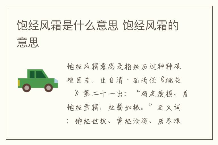 饱经风霜意思是指经历过种种艰难困苦。出自清·孔尚任《桃花扇》第二十一出:“鸡皮瘦损,看饱经雪霜,丝鬓如银。”近义词:饱经世故、曾经沧海、历尽艰辛、历尽沧桑、历经风霜。反义词:不谙世事、初出茅庐、养尊处优、一帆风顺。
