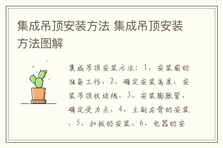 集成吊顶安装方法:1、安装前的准备工作,2、确定安装高度,安装吊顶收边线,3、安装膨胀管,确定受力点,4、主副龙骨的安装,5、扣板的安装,6、电器的安装,集成吊顶安装完成后需要自我检查一下,例如安装好开关,注意要进行通电测试,符合要求后盖好接线盒。最后检查扣板安装是否平整,电器是否能正常使用。