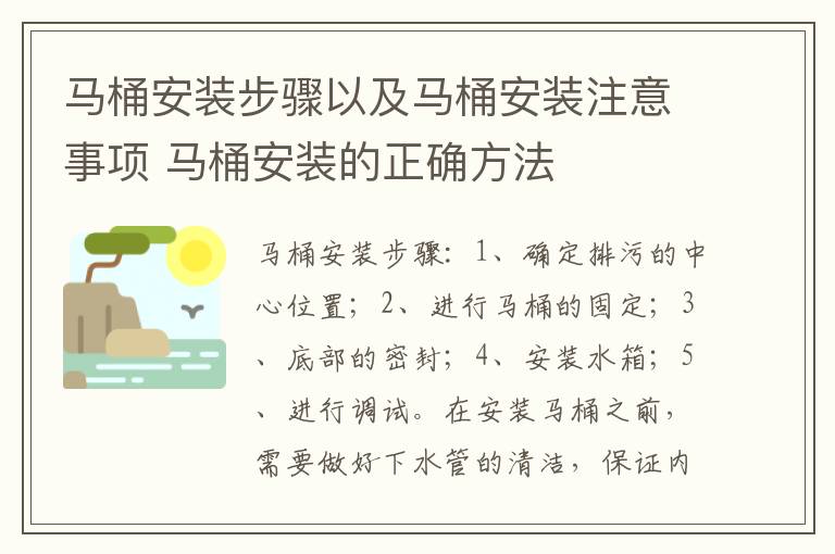 马桶安装步骤:1、确定排污的中心位置;2、进行马桶的固定;3、底部的密封;4、安装水箱;5、进行调试。在安装马桶之前,需要做好下水管的清洁,保证内部不会有残留的泥沙杂物,以免造成下水管的堵塞。而且要看马桶位置是否平整,若果没平,最好立马进行地面找平。只有等这两项确定无误后,再进行下一个步骤。