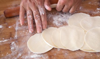 5、面团揉好后不用醒面,直接放案板上搓成长条,切成大小均匀的剂子,上面撒点干面粉防粘,然后把剂子揉圆,按扁,擀成饺子皮,包上调好的驴肉馅,用平时包饺子的手法把它包成饺子,饺子全部包好后备用。