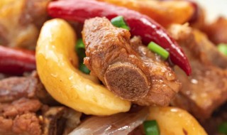 5、起锅放适量油将排骨放下翻炒,炒至断生即可,放入姜、干辣椒翻炒片刻。