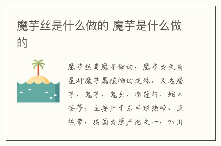 魔芋丝是魔芋做的,魔芋为天南星科魔芋属植物的泛称,又名磨芋、鬼芋、鬼头、花莲杆、蛇六谷等,主要产于东半球热带、亚热带,我国为原产地之一,四川、湖北、云南、贵州、陕西、广东、广西、等省山区均有分布。生魔芋是不能够直接吃的,里面含有着一些不好的成分,需要经过加工处理,彻底煮熟之后才能够制作成为魔芋丝。