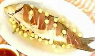4、将拌匀的馅灌入鲫鱼腹内,留用的莲子沿鱼的边围上一圈,将葱、姜拍破放在鱼身上,加入鸡油蒸15分钟。
