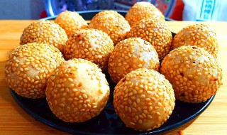 2、接着把面团取出,用手揉搓成长条状,再切成大小相等的小面团,用手将其搓圆,放到清水当中过一遍,再放到装有芝麻的碗中裹上一圈,然后往锅中倒入适量的食用油,烧热后把裹好芝麻的面团放到锅中,转成小火慢慢地用锅铲转动面团,等到面团漂浮上来后用锅铲按压转动,这个时候面团就会变大变圆,颜色也会变成金黄色,再捞出沥干油分即可。