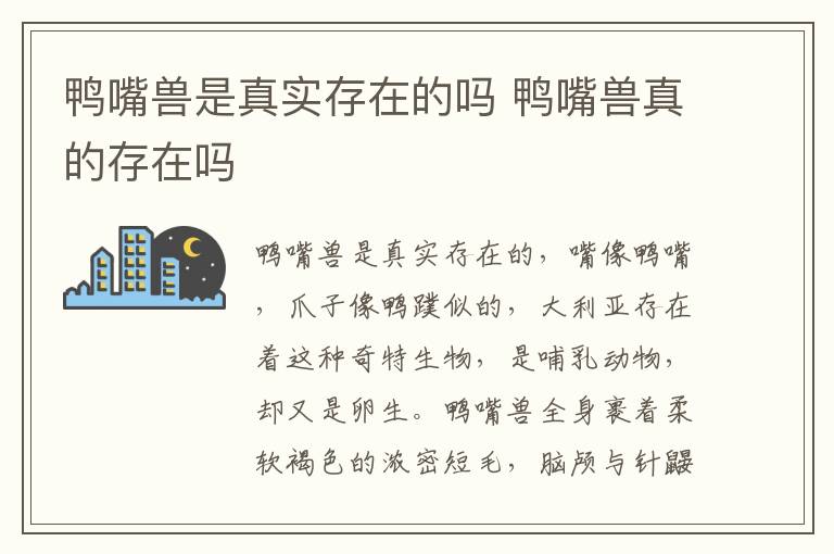 鸭嘴兽是真实存在的,嘴像鸭嘴,爪子像鸭蹼似的,大利亚存在着这种奇特生物,是哺乳动物,却又是卵生。鸭嘴兽全身裹着柔软褐色的浓密短毛,脑颅与针鼹相比,较小,大脑呈半球状,光滑无回。四肢很短,五趾具钩爪,趾间有薄膜似的蹼,酷似鸭足,在行走或挖掘时,蹼反方向褶于掌部。