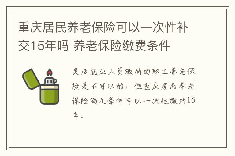 重庆社保中的养老保险缴纳15年且到达国家法定的退休年龄之后可以领取养老金。那么重庆养老保险能不能一次性缴满15年呢,灵活就业人员缴纳的职工养老保险是不可以的,但重庆居民养老保险满足条件可以一次性缴纳15年。