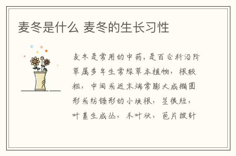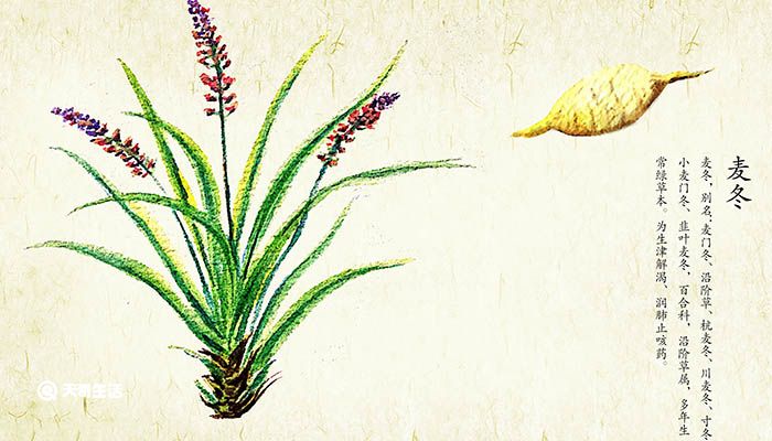麦冬是常用的中药,是百合科沿阶草属多年生常绿草本植物,根较粗,中间或近末端常膨大成椭圆形或纺锤形的小块根,茎很短,叶基生成丛,禾叶状,苞片披针形,先端渐尖,种子球形,花期5-8月,果期8-9月。