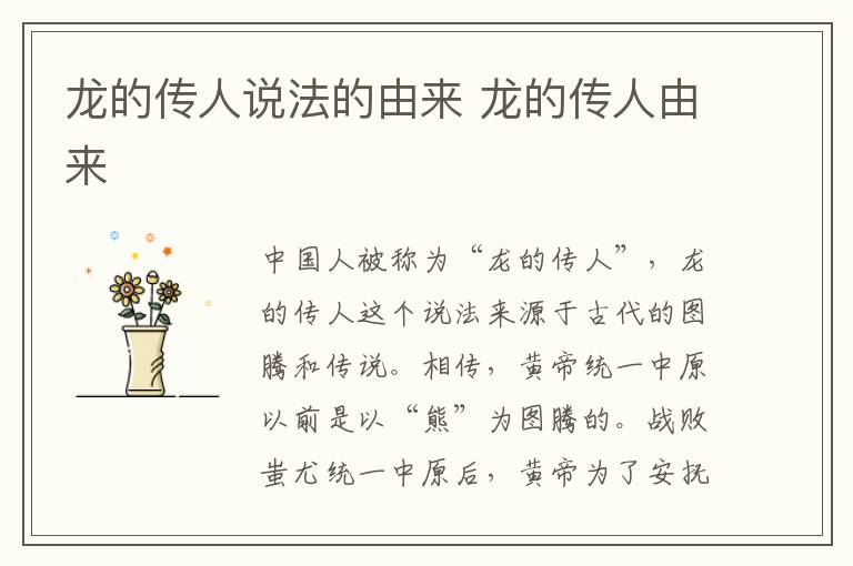 “龙”成了中华民族始祖的图腾,中华民族也就和“龙”联系在一起了。于是,围绕“龙”产生了“感天而生”的传说,说炎帝是一位叫登的女子感动上天的神龙而生,黄帝是附宝感动“北斗”而生,尧是庆都感动“赤龙”而生。既然中华民族的始祖是上天“龙”的传身,那么,中华民族的子孙当然都是龙的传人了。