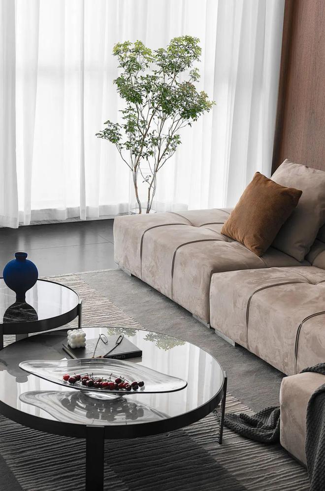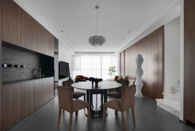 餐边柜那温润的木和利落的线条协调统一了客餐厅的氛围,让精致的生活融入空间的每个角落。
