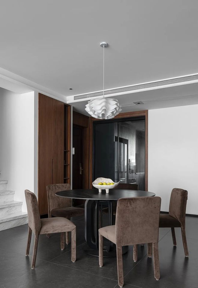每一寸空间都充满设计的细节,比起单纯的平面更显张力。客厅与餐厅串联,全开放的布局营造空间的深度,使整体空间更加通透、大气。大面积的白色和胡桃木的碰撞,增加了些许的柔和,温暖了生活的意趣。