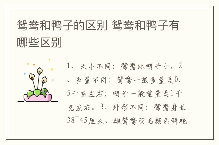 1、大小不同:鸳鸯看起来是比较小的;而鸭子看起来是比较大的。